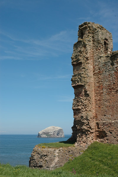Ruines du chateau de Tantallon et au loin l'île de Bass Rock qui abrite une colonie de fous de bassan