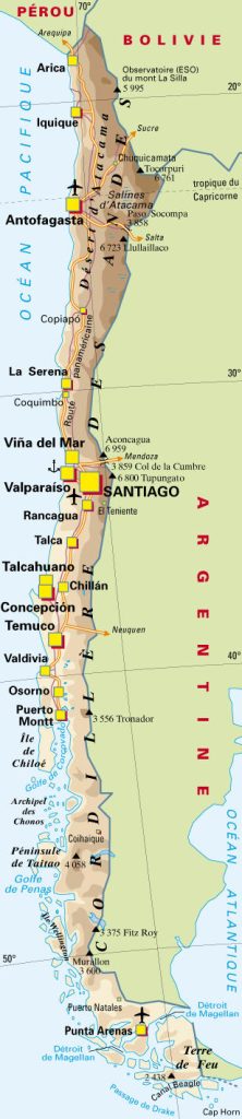 Situé sur la côte pacifique de l’Amérique du Sud, le Chili s’étire sur ses 4 300 kilomètres de long, du Pérou au cap Horn, avec une largeur moyenne de 180 kilomètres (de 440 kilomètres au maximum à 90 kilomètres au minimum). Des frontières naturelles isolent le Chili de ses voisins : il est séparé de l’Argentine par la Cordillère des Andes, de la Bolivie et du Pérou par le désert d’Atacama. La superficie totale du pays est de 756 900 km², en comprenant l’archipel de Juan Fernández et l’île de Pâques. Le Chili revendique par ailleurs 1 250 000 km² de l’Antarctique.