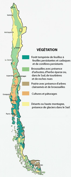 Dans la zone centre-nord du pays apparaissent des formations boisées très dégradées par les incendies, l’abattage destiné à la fabrication de charbon et le défrichement pour l’agriculture. Parmi les espèces caractéristiques de la végétation de la vallée centrale, on peut citer entre autres l’acacia caven, le boldo, le litre, le quillay, l’arrayán, le maitén, le buddleia globuleux, le roble et le cocotier du Chili. Le puma, le ragondin, le dègue du Chili, le loup de Magellan, le treile, l’ibis mandore, la grive, le diuca leucoptère et le loro tricahue (espèce de perroquet) sont des animaux vivant dans la région centrale. Au sud du fleuve Biobío, la végétation se diversifie et devient une forêt de type valdivienne. Certaines espèces végétales comme le Goyavier du Chili, le copihue, fleur nationale, des fougères et des arbres divers comme le laurel, le tepa (ou huahuan), l’arrayán, le chequén, le tinéo, l’avellano (ou noisetier du Chili), diverses espèces de Podocarpus et l’alerce (ou cyprès de Patagonie) caractérisent ce type de forêt. Le puma est le principal animal carnivore de la zone et vit dans presque tout le pays, sauf dans certains territoires où il a été éradiqué par l’homme. D’autres espèces animales caractéristiques sont le cygne à cou noir, le chat des pampas (ou colocolo), le pudu et le monito del monte (marsupial lui aussi également appelé colocolo). Un des principaux problèmes environnementaux de la zone est la substitution de bois natifs par des plantations de pins et d’eucalyptus.