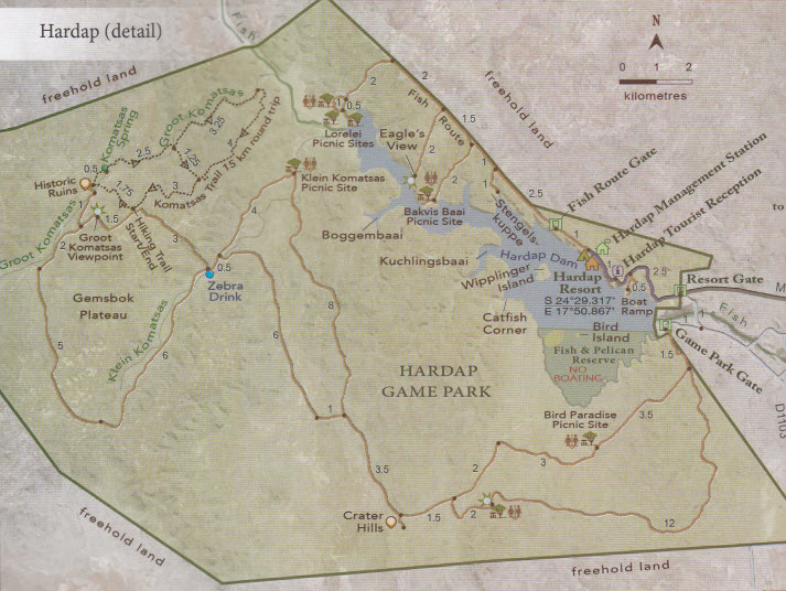 La réserve de Hardap (crée en 1968, 243 km2) a tendance à être une révélation pour les visiteurs. Ses paysages sont saisissants. Ce sont des franges escarpées du Nama Karoo, avec leurs teintes violettes typiques, leur végétation clairsemée, leur topographie accidentée. Elles abritent une faune sauvage diversifiée et abondante du désert.