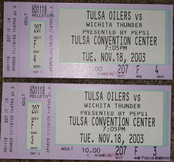Novembre 2003 : Mardi 18, nous sommes allés voir un match de Hockey (Tulsa Oilers contre Wichita Thunder) en ligue US Central (comprenant le texas, le nouveau-mexique, le colorado, le kansas, la louisiane, le Tennessee, l'Indiana et l'Oklahoma). C'était très sympa à voir, le niveau de jeu est déjà très élevé et il y a même eu quelques bastons (comme dans tout match de hockey qui se respecte). Tulsa gagne 2 à 1 et se situe en 3ème place de la ligue qui comprend 17 équipes. Photo1 Photo2 Photo3